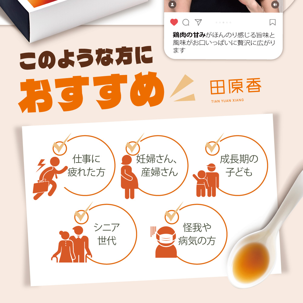 田原香のチキンエッセンスは、台湾衛服部(厚生労働省)が発行されたの厳格な健康食品認証を取得。ナツメとクコの実のほんのりとした甘味が鶏の旨味と溶け合い、自然なやさしい味わいをお楽しみいただけます。